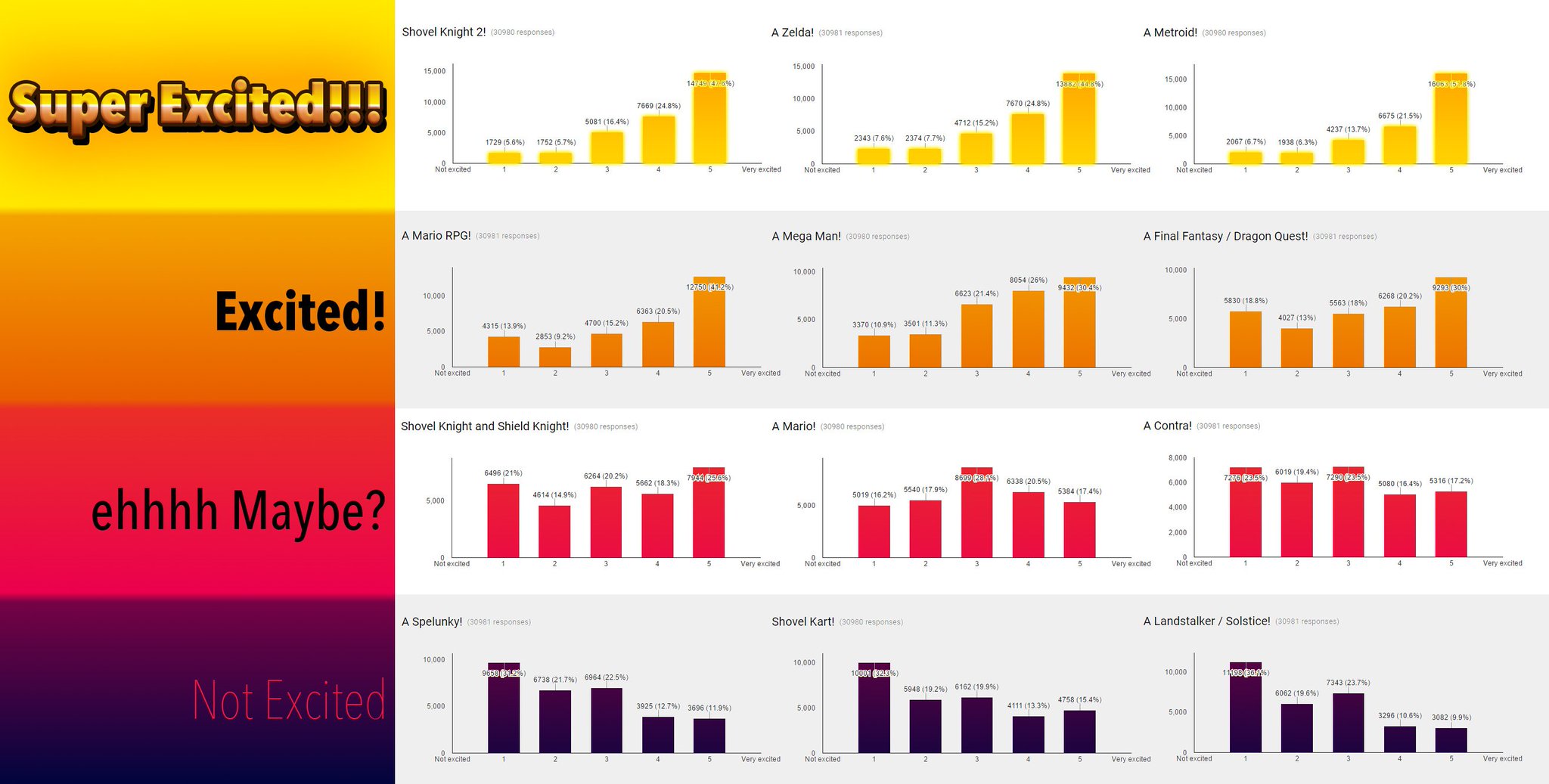 Au final c'est le Shovel Knight 2, le Zelda-Like et le Metroid-like qui ont eu le plus de vote positifs: