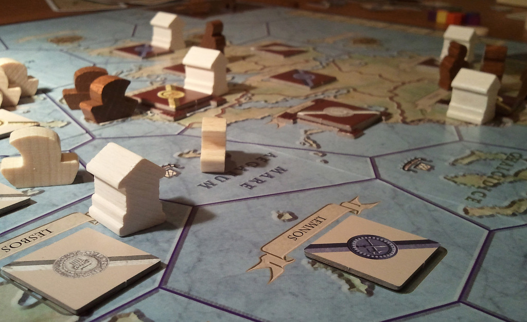 Jeu essentiellement à deux (bah ouais duellum), conquête avec gestion de ressources light et compétences. Le but est de remporter 9 cartes "personnages", correspondant chacune à un objectif : détruire un temple adverse, regner sur 7 territoires en mer, construire 7 cités, découvrir un nouveau savoir, etc..
